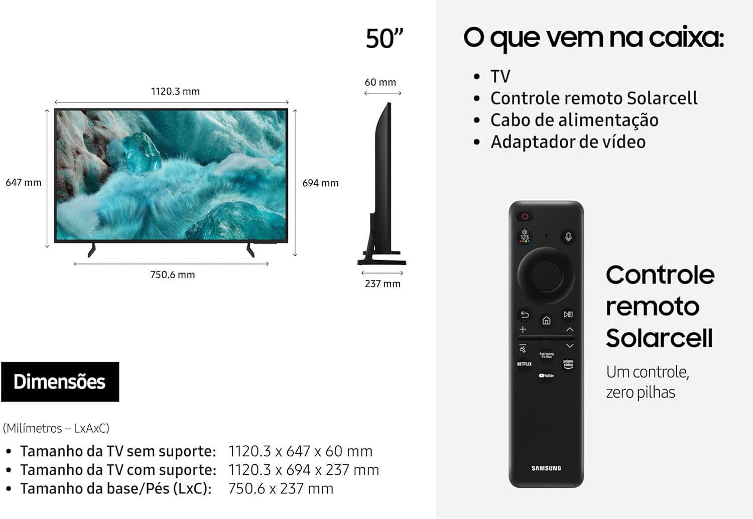 Vision AI: QLED de Verdade: Mais de 1 bilhão de cores verdadeiras na sua tela. A Tecnologia de Pontos Quânticos garante que seus conteúdos tenham 100% do volume de cor, ressaltados com naturalidade através de uma camada de cristais associada ao Color Booster com AI. Tudo isso na primeira TV certificada pela PANTONE, referência mundial em especificação de cores. Além disso, é um produto sem cádmio em sua composição, um metal pesado danoso à saúde e ao meio ambiente.